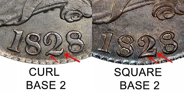 What This Coin Looks Like (Obverse, Reverse, Mint Mark Location, Special Features, etc.): There were multiple varieties and sub-varieties of the 1828 Capped Bust Half Dollar. The two major varieties deal with the style of the number "2". One variety has a curved or curled base on the number "2" while the other variety has a square base 2 with a flat base that comes up at a straight angle as depicted above the example comparison image.