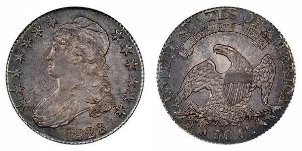 What This Coin Looks Like (Obverse, Reverse, Mint Mark Location, Special Features, etc.): Another major variety is the 1828 Capped Bust Half Dollar with a square base on the "2". This variety features small number 8's in the 1828 date and large letters on the reverse of the coin. Unlike the curl base 2 - the square base is flat and comes up at straight square angle. The difference between the square base 2 vs curl base 2 is depicted below in the example image of the coin varieties: