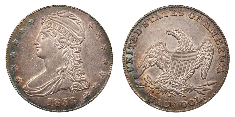 What This Coin Looks Like (Obverse, Reverse, Mint Mark Location, Special Features, etc.): The design was changed on the 1838 Capped Bust Half Dollar. The "50 CENTS" denomination at the bottom of the reverse was changed to "HALF DOL." and was used for the next half century throughout the Seated Liberty Half Dollars series.