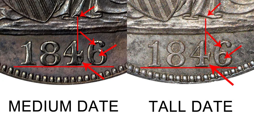 The Medium Date features smaller and shorter numbers whereas the Tall Date features taller and larger numbers. The easiest way to distinguish the two varieties is to note the number "4". The Medium "4" has the right-side and bottom serifs nearly touching each other while the Tall "4" has a nice gap between the serifs as depicted by the arrows in the example image below. The medium sized "8" sits lower than the rest of the numbers in the date - but the tall "8" lines up with all of the numbers. The medium "6" has a smaller gap in the upper portion within the "6" and a larger space on the bottom portion. The tall "6" however has a larger gap in the upper portion within the "6" and a smaller space on the bottom. Lastly: The medium "4" lines up vertically more towards the left side of the seated liberty portrait whereas the tall "4" is lined up more towards the right side. These features are depicted below in the example comparison image of the 1846 Medium Date vs Tall Date Seated Liberty Half Dollar: