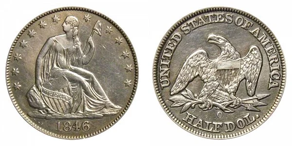 What This Coin Looks Like (Obverse, Reverse, Mint Mark Location, Special Features, etc.): There were two major varieties of the 1846 O Seated Liberty Half Dollar in regards to the size and style of the numbers in the 1846 date. The variety depicted above is the "Medium Date" variety.