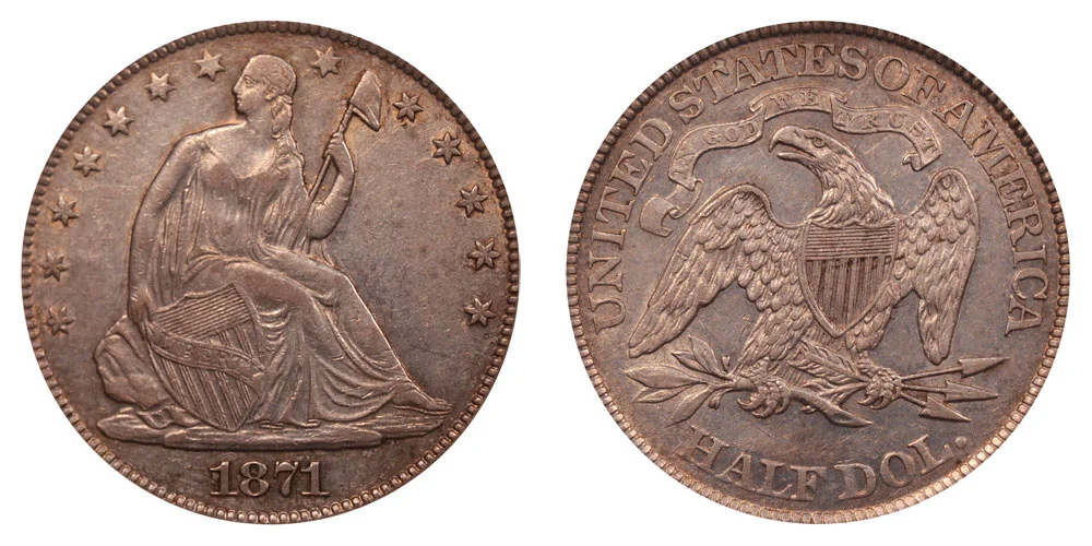 USA Coin Book Estimated Value of 1871 Seated Liberty Half Dollar is Worth $116 in Average Condition and can be Worth $919 to $1,624 or more in Uncirculated (MS+) Mint Condition. Proof Coins can be Worth $1,547 or more. Click here to Learn How to use Coin Price Charts . Also, click here to Learn About Grading Coins . The Melt Value shown below is how Valuable the Coin's Metal is Worth (bare minimum value of coin). Click here to see the Melt Value of every US Coin .