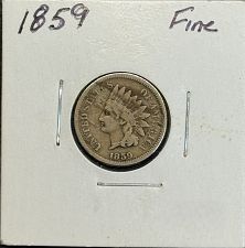 USA Coin Book Estimated Value of 1859 Indian Head Penny (Laurel Wreath Reverse Without Shield Variety) is Worth $25 in Average Condition and can be Worth $437 to $997 or more in Uncirculated (MS+) Mint Condition. Proof Coins can be Worth $2,257 or more. Click here to Learn How to use Coin Price Charts . Also, click here to Learn About Grading Coins . The Melt Value shown below is how Valuable the Coin's Metal is Worth (bare minimum value of coin). Click here to see the Melt Value of every US Coin .