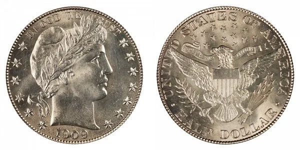 USA Coin Book Estimated Value of 1909 Barber Half Dollar is Worth $59 in Average Condition and can be Worth $637 to $1,089 or more in Uncirculated (MS+) Mint Condition. Proof Coins can be Worth $1,369 or more. Click here to Learn How to use Coin Price Charts . Also, click here to Learn About Grading Coins . The Melt Value shown below is how Valuable the Coin's Metal is Worth (bare minimum value of coin). Click here to see the Melt Value of every US Coin .
