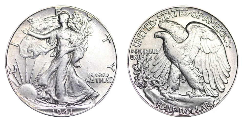USA Coin Book Estimated Value of 1941 Walking Liberty Half Dollar is Worth $42 in Average Condition and can be Worth $68 to $94 or more in Uncirculated (MS+) Mint Condition. Proof Coins can be Worth $637 or more. Click here to Learn How to use Coin Price Charts . Also, click here to Learn About Grading Coins . The Melt Value shown below is how Valuable the Coin's Metal is Worth (bare minimum value of coin). Click here to see the Melt Value of every US Coin .