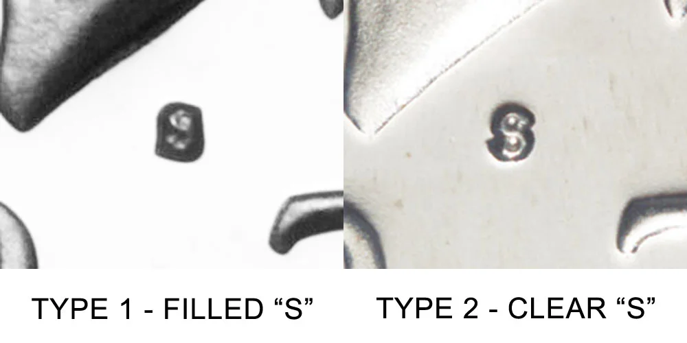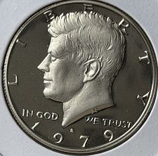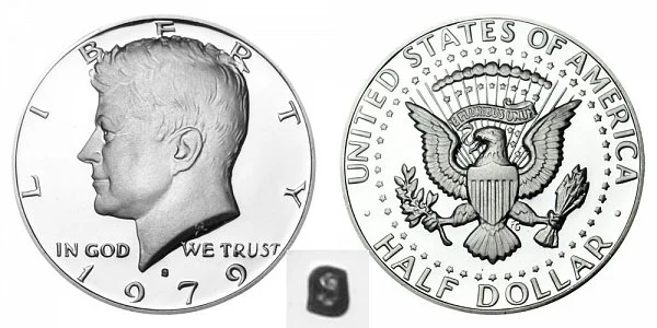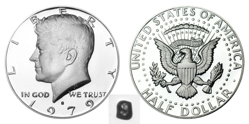 What This Coin Looks Like (Obverse, Reverse, Mint Mark Location, Special Features, etc.): The 1979 Type 1 Filled S Kennedy Half Dollar has a smaller S mint mark which is partially filled in and not as clear and is only found as a proof coin. Depicted below is an example comparison image between the type 1 filled "S" vs type 2 clear "S":