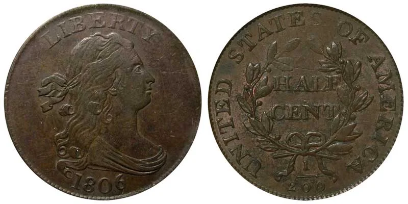 One major variety of the 1806 Draped Bust Half Cent (Penny) features a small "6" in the 1806 date on the obverse of the coin. The reverse of the coin also features two stems at the bottom of the wreath.