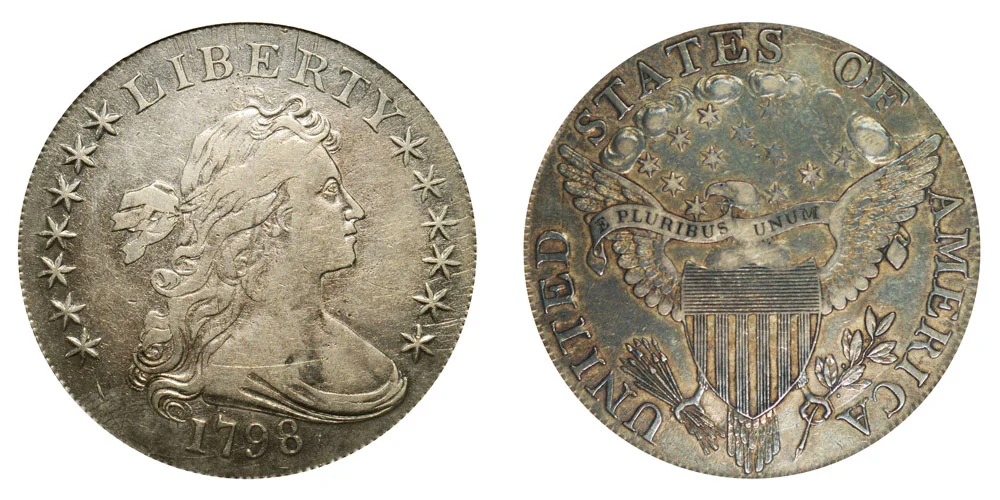What This Coin Looks Like (Obverse, Reverse, Mint Mark Location, Special Features, etc.): One major variety of the 1798 Draped Bust Silver Dollar features a Knob 9 on the obverse of the coin and 4 vertical stripes or lines on the shield on the reverse of the coin as depicted above.