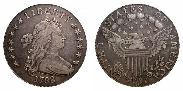 What This Coin Looks Like (Obverse, Reverse, Mint Mark Location, Special Features, etc.): One major variety of the 1798 Draped Bust Silver Dollar features a Pointed 9 on the obverse of the coin and a closely spaced date - but with the 8 being aligned normally. This variety is depicted above.