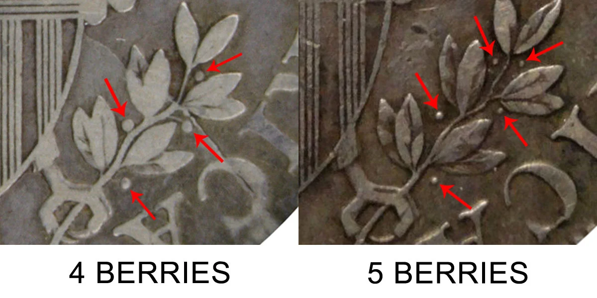 There are two major varieties regarding the number of berries in a branch being held in the eagle's claw. One variety features a branch bearing 4 berries while the other has 5 berries. The difference between the 4 berries vs 5 berries varieties is depicted below in the example comparison image: