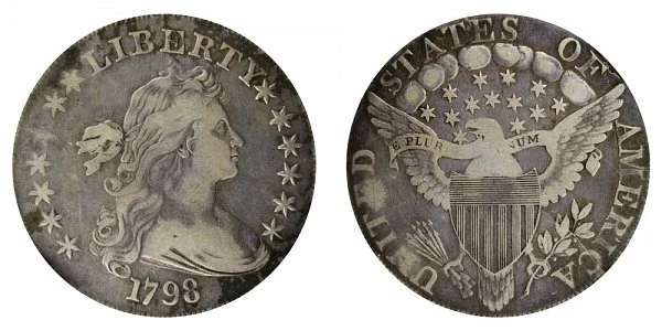 What This Coin Looks Like (Obverse, Reverse, Mint Mark Location, Special Features, etc.): One major variety of the 1798 Draped Bust Silver Dollar features a Pointed 9 on the obverse of the coin and 4 berries in the branch that the eagle is holding in it's claw on the reverse of the coin. This variety is depicted above.