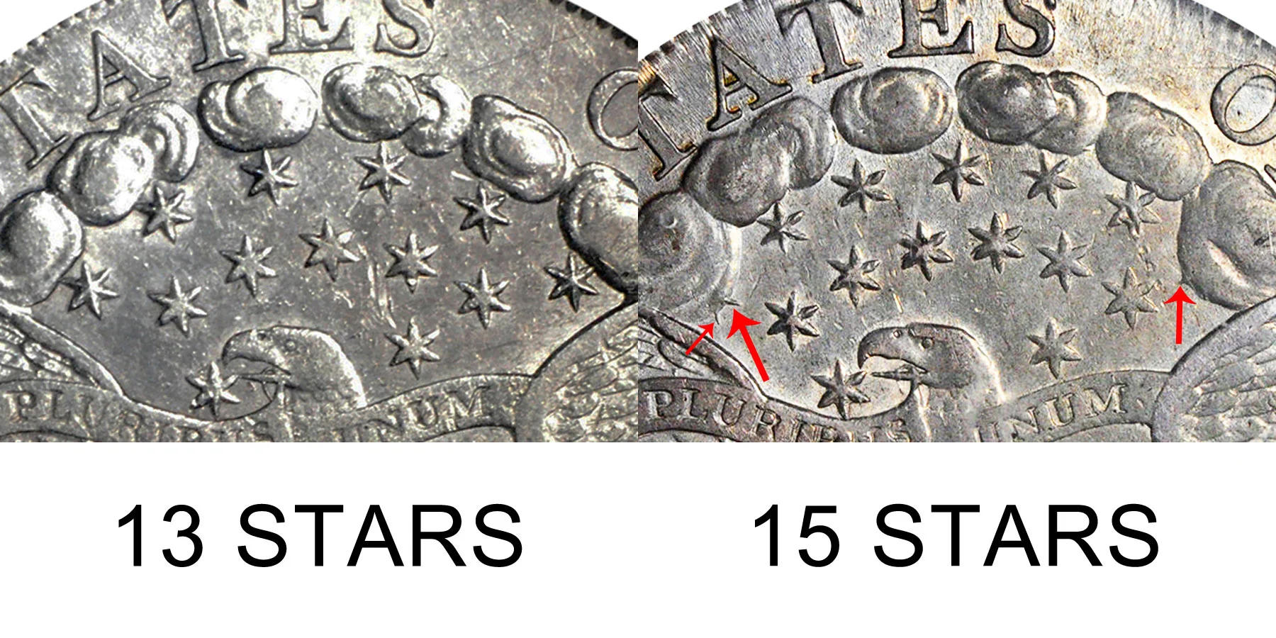 There are also two major varieties regarding the reverse of the coin - particularly the number of stars featured just above the eagle. One variety features the standard 13 stars and the other is actually a corrected error featuring 15 stars. The engraver accidently added 15 stars and then tried to correct the error by enlarging the size of the first and last clouds to cover two of the stars up. Although there are still spikes from each of these stars protruding from the clouds - which helps us identify the variety. The difference between the 13 stars vs 15 stars reverse is depicted below in the example comparison image: