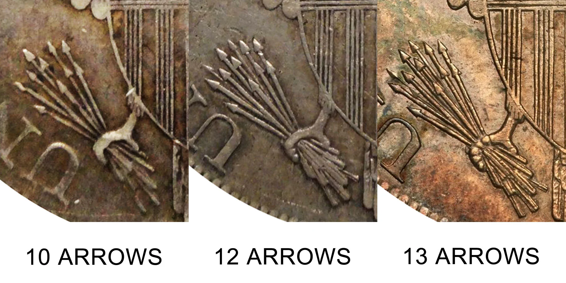 Another major variety of the 1800 Draped Bust Silver Dollar features 12 arrows on the reverse of the coin. Typically there are 13 arrows being held in the eagle's claw and another are variety has 10 arrows. The difference between the 10 arrows vs 12 arrows vs 13 arrows draped bust silver dollar varieties is depicted below in the example comparison image: