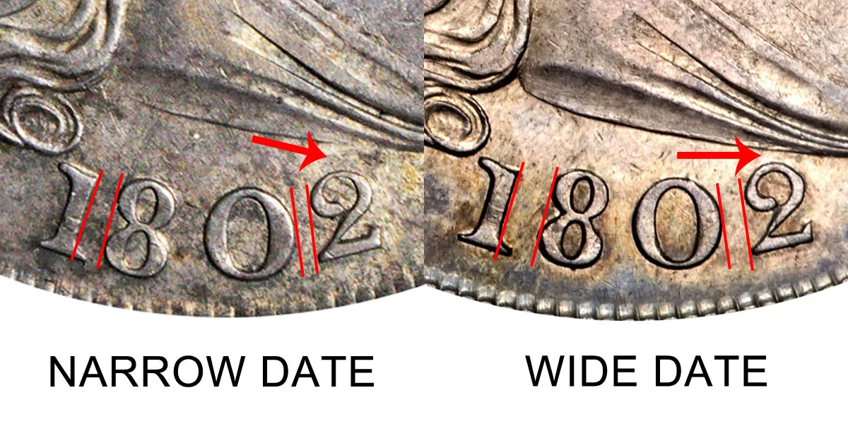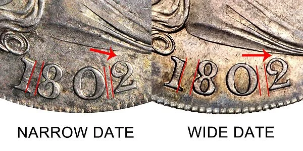What This Coin Looks Like (Obverse, Reverse, Mint Mark Location, Special Features, etc.): There were several major varieties of the 1802 Draped Bust Silver Dollar. Two of them have the normal date with no major errors - but with different styling of the date. One has a Narrow Date (Close Date) in which the numbers were closer together and the "2" was further away from the liberty bust. The other variety is the Wide Date in which there was more spacing between the numbers and the "2" was noticeably closer to the liberty bust. The difference between the 1802 Narrow Date vs Wide Date is depicted above in the example comparison image.