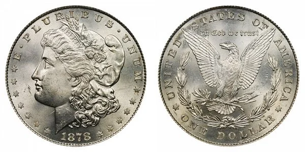 What This Coin Looks Like (Obverse, Reverse, Mint Mark Location, Special Features, etc.): One major variety of the 1878 Morgan Silver Dollar features 8 Tail Feathers on the eagle at the reverse of the coin. Other later versions were changed to 7 tail feathers. The difference between the 7 Tail Feathers vs 8 Tail Feathers is depicted below in the example comparison image: