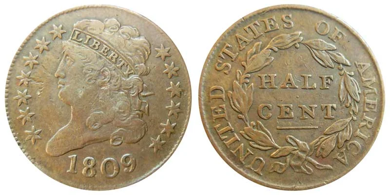USA Coin Book Estimated Value of 1809 Classic Head Half Cent (Normal Date Variety) is Worth $117 in Average Condition and can be Worth $929 to $1,674 or more in Uncirculated (MS+) Mint Condition. Click here to Learn How to use Coin Price Charts . Also, click here to Learn About Grading Coins . The Melt Value shown below is how Valuable the Coin's Metal is Worth (bare minimum value of coin). Click here to see the Melt Value of every US Coin .