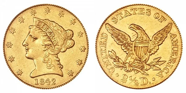 USA Coin Book Estimated Value of 1842 Coronet Head Gold $2.50 Quarter Eagle is Worth $3,440 in Average Condition and can be Worth $24,955 to $62,957 or more in Uncirculated (MS+) Mint Condition. Click here to Learn How to use Coin Price Charts. Also, click here to Learn About Grading Coins. The Melt Value shown below is how Valuable the Coin's Metal is Worth (bare minimum value of coin). Click here to see the Melt Value of every US Coin.