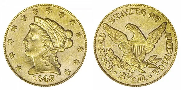 What This Coin Looks Like (Obverse, Reverse, Mint Mark Location, Special Features, etc.): One major variety of the 1843 C Liberty Head $2.50 Gold Quarter Eagle features a Small Date and Crosslet "4" in the 1843 date. The small date has much smaller numbers and always features a crosslet on the right side of the number "4". The difference between the 1843 C Small Date vs Large Date (Crosslet 4 vs Plain 4) gold quarter eagle is depicted below in the example comparison image: