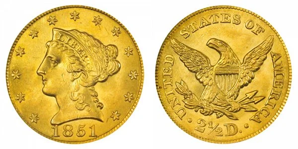 USA Coin Book Estimated Value of 1851 Coronet Head Gold $2.50 Quarter Eagle is Worth $1,009 in Average Condition and can be Worth $1,133 to $1,687 or more in Uncirculated (MS+) Mint Condition. Click here to Learn How to use Coin Price Charts . Also, click here to Learn About Grading Coins . The Melt Value shown below is how Valuable the Coin's Metal is Worth (bare minimum value of coin). Click here to see the Melt Value of every US Coin .