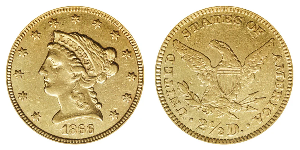 1866 Liberty Head $2.50 Gold Quarter Eagle - 2 1/2 Dollars