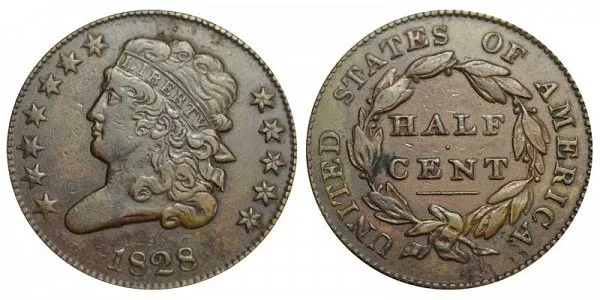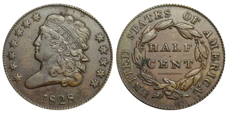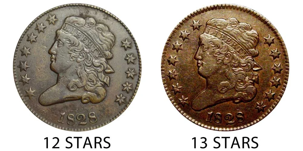 What This Coin Looks Like (Obverse, Reverse, Mint Mark Location, Special Features, etc.): One major variety of the 1828 Classic Head Half Cent (Penny) features 12 stars on the obverse of the coin as depicted above. The difference between the 12 stars vs 13 stars varieties is depicted below in the example comparison image: