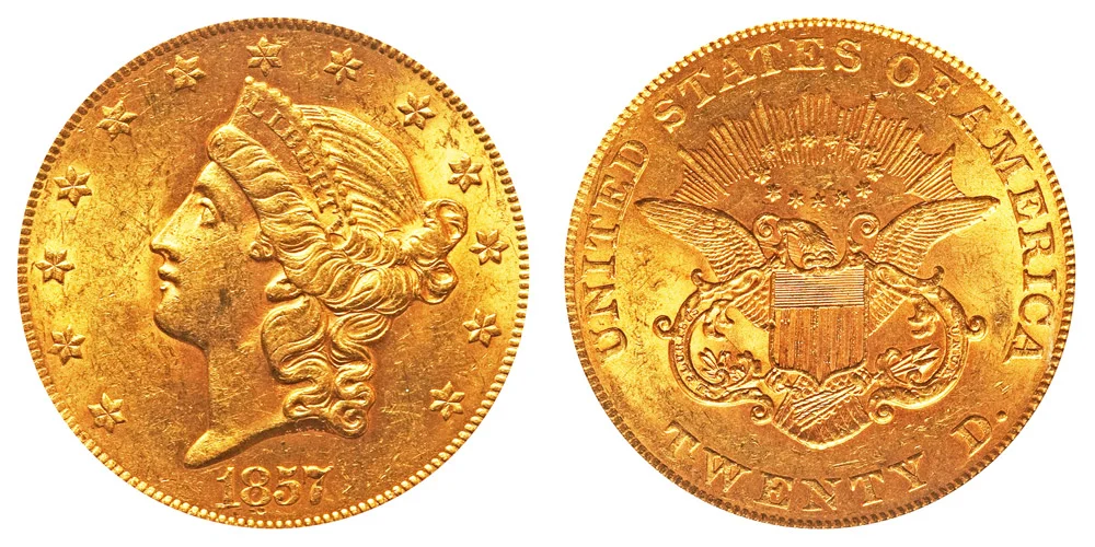 Gold $20 Double Eagle Coronet Head 1857-P