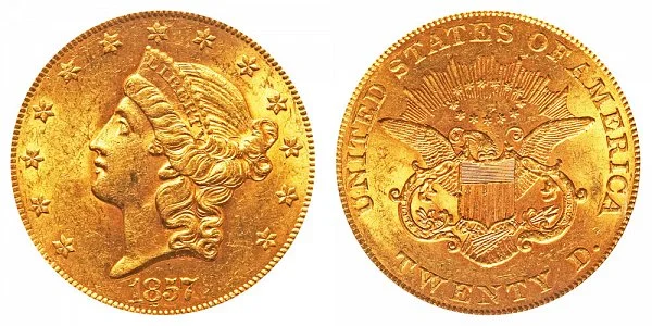 USA Coin Book Estimated Value of 1857 Coronet Head Gold $20 Double Eagle is Worth $5,606 in Average Condition and can be Worth $9,667 to $52,811 or more in Uncirculated (MS+) Mint Condition. Click here to Learn How to use Coin Price Charts . Also, click here to Learn About Grading Coins . The Melt Value shown below is how Valuable the Coin's Metal is Worth (bare minimum value of coin). Click here to see the Melt Value of every US Coin .