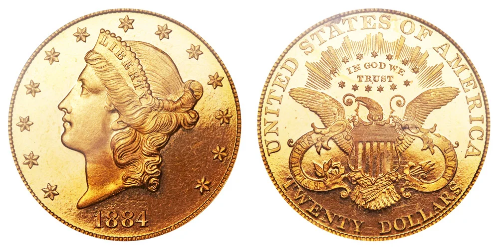 What This Coin Looks Like (Obverse, Reverse, Mint Mark Location, Special Features, etc.): All 1884 Liberty Head $20 Gold Double Eagles in Philadelphia were struck as proof coins. Only 71 were produced and they are extremely rare and valuable. Source of example image is courtesy of Heritage Auction Galleries.