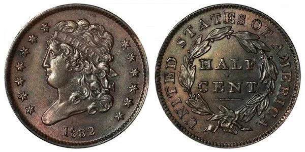 USA Coin Book Estimated Value of 1832 Classic Head Half Cent is Worth $100 in Average Condition and can be Worth $313 or more in Uncirculated (MS+) Mint Condition. Proof Coins can be Worth $15,245 or more. Click here to Learn How to use Coin Price Charts . Also, click here to Learn About Grading Coins . The Melt Value shown below is how Valuable the Coin's Metal is Worth (bare minimum value of coin). Click here to see the Melt Value of every US Coin .
