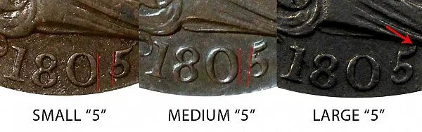 There are a few major varieties of the 1805 Draped Bust Half Cent (Penny). There are three different sizes of the number "5" in the 1805 date on the obverse of the coin. The small "5" can be identified by being the smallest size and is further (widely spaced) away from the "0" whereas the medium "5" is very slightly larger and spaced closer to the "0". The large "5" is much easier to identify as it is noticeably larger and nearly touches the bust of the liberty head portrait. The difference between the Small 5 vs Medium 5 vs Large 5 is depicted above in the example comparison image of the coins.