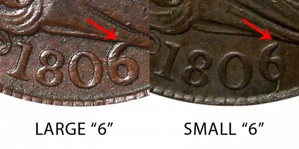 What This Coin Looks Like (Obverse, Reverse, Mint Mark Location, Special Features, etc.): There were a few major varieties of the 1806 Draped Bust Half Cent (Penny). Two varieties deal with the size of the number "6" in the 1806 date on the obverse of the coin. The small "6" had some spacing between the liberty head bust whereas the large "6" can be easily identified by how it touches and protrudes into the bust of the liberty head on the obverse of the coin. The difference between the small 6 vs large 6 is depicted above in the example comparison image of the coins.