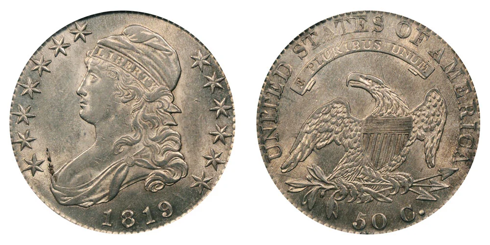 What This Coin Looks Like (Obverse, Reverse, Mint Mark Location, Special Features, etc.): There were a few major varieties of the 1819 Capped Bust Half Dollar. The most common variety is simply the Normal Date type which features no errors or major notable features as depicted above.