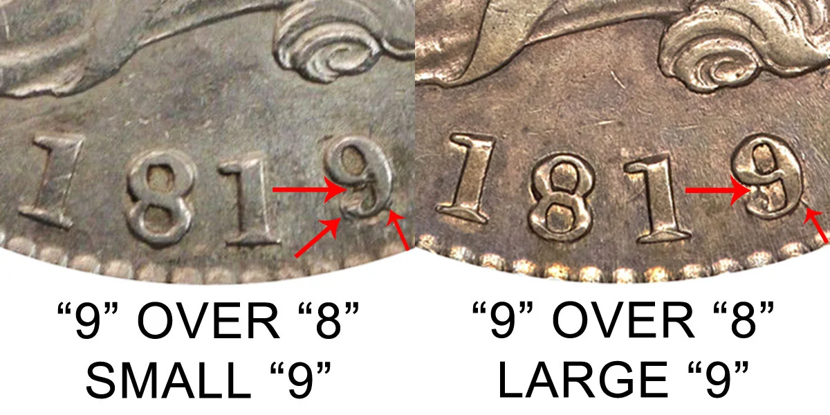 Two major varieties are both 1819/8 Capped Bust Half Dollar overdate errors in which an 1819 date was struck over an 1818 date. This resulted in a "9" over "8" where parts of the underlying "8" appear within and around the "9". However - one variety features a small number "9" which is thinner and smaller while the other features a large "9" which is noticeably thicker and wider. The difference between the large 9 vs small 9 is depicted below in the example comparison image: