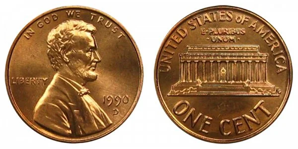 USA Coin Book Estimated Value of 1990-D Lincoln Memorial Penny is Worth $0.36 or more in Uncirculated (MS+) Mint Condition. Click here to Learn How to use Coin Price Charts . Also, click here to Learn About Grading Coins . The Melt Value shown below is how Valuable the Coin's Metal is Worth (bare minimum value of coin). Click here to see the Melt Value of every US Coin .