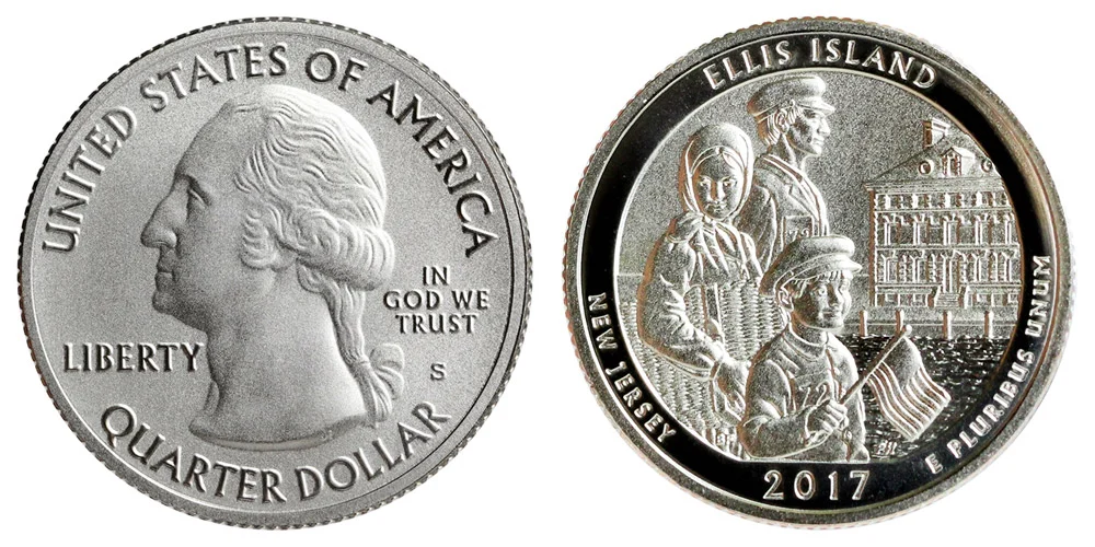 What This Coin Looks Like (Obverse, Reverse, Mint Mark Location, Special Features, etc.): "Ellis Island National Monument - New Jersey" The 2017-S Enhanced Uncirculated Finish Ellis Island Quarter is part of a special set of coins to commemorate the 225th anniversary of the US Mint.