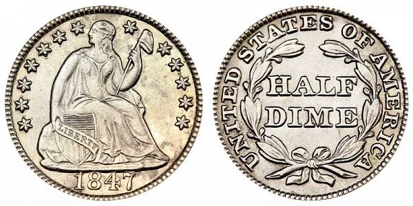 USA Coin Book Estimated Value of 1847 Seated Liberty Half Dime is Worth $40 in Average Condition and can be Worth $284 to $500 or more in Uncirculated (MS+) Mint Condition. Click here to Learn How to use Coin Price Charts . Also, click here to Learn About Grading Coins . The Melt Value shown below is how Valuable the Coin's Metal is Worth (bare minimum value of coin). Click here to see the Melt Value of every US Coin .