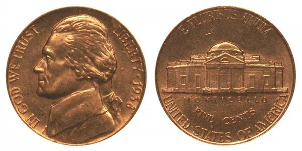 USA Coin Book Estimated Value of 1938 Jefferson Nickel is Worth $0.36 in Average Condition and can be Worth $6.25 to $19 or more in Uncirculated (MS+) Mint Condition. Proof Coins can be Worth $144 or more. Click here to Learn How to use Coin Price Charts . Also, click here to Learn About Grading Coins . The Melt Value shown below is how Valuable the Coin's Metal is Worth (bare minimum value of coin). Click here to see the Melt Value of every US Coin .