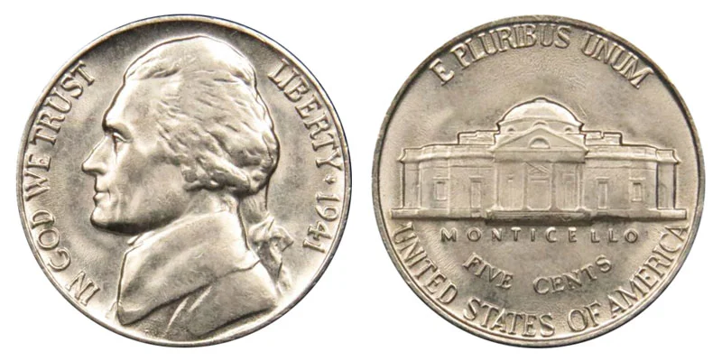USA Coin Book Estimated Value of 1941 Jefferson Nickel is Worth $0.18 in Average Condition and can be Worth $1.05 to $15 or more in Uncirculated (MS+) Mint Condition. Proof Coins can be Worth $92 or more. Click here to Learn How to use Coin Price Charts . Also, click here to Learn About Grading Coins . The Melt Value shown below is how Valuable the Coin's Metal is Worth (bare minimum value of coin). Click here to see the Melt Value of every US Coin .