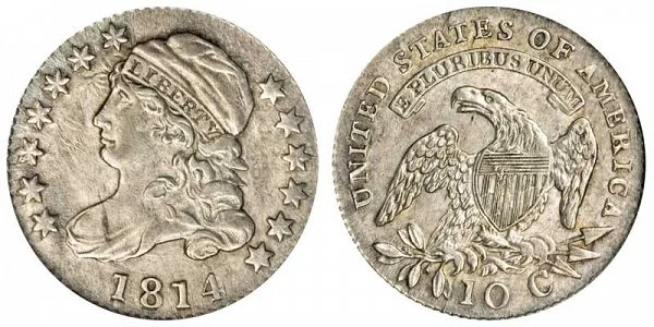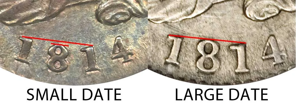 This variety of the 1814 Capped Bust Dime features a larger 1814 date. The difference between the 1814 large date vs small date can be best identified by first lining up the two "1"s in the date. The "8" in the small date will be lower than the line and will be smaller while the large date "8" will line up and will be larger. Source of example image is courtesy of Heritage Auctions. The comparison can be seen in the example image of the coins below: