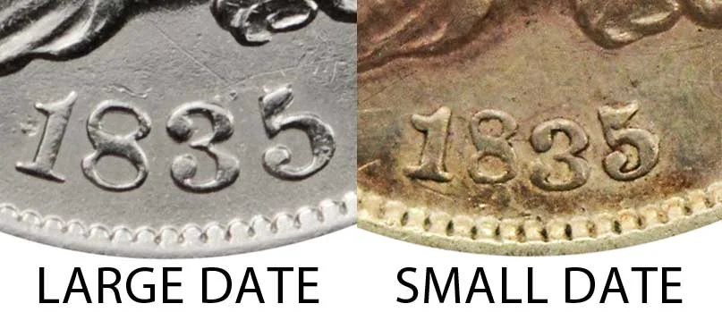 There were two major varieties that dealt with the size of the 1835 date on the obverse of the Capped Bust Half Dime and two major varieties that dealt with the size of the "5 C." on the reverse of the coin. This made up 4 different available combinations of varieties. Depicted below is an example image comparing the differences between the Large Date vs Small Date and a second example comparing the differences between the Large 5C vs Small 5c 1835 Capped Bust Half Dimes. It is fairly easily to differentiate the varieties: