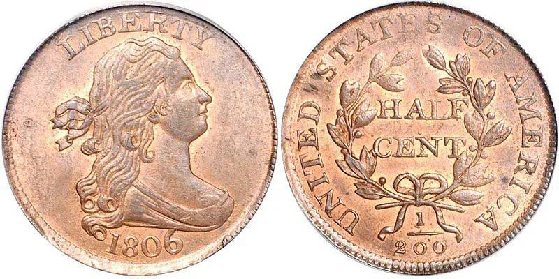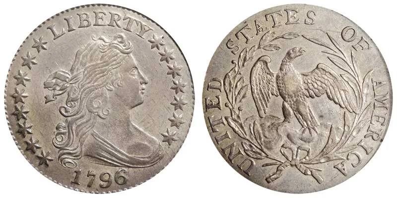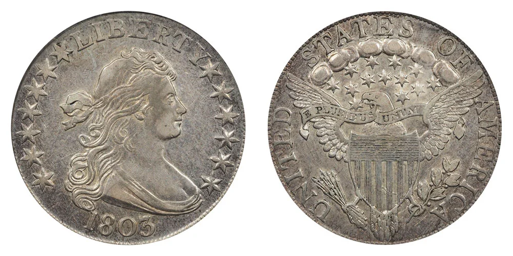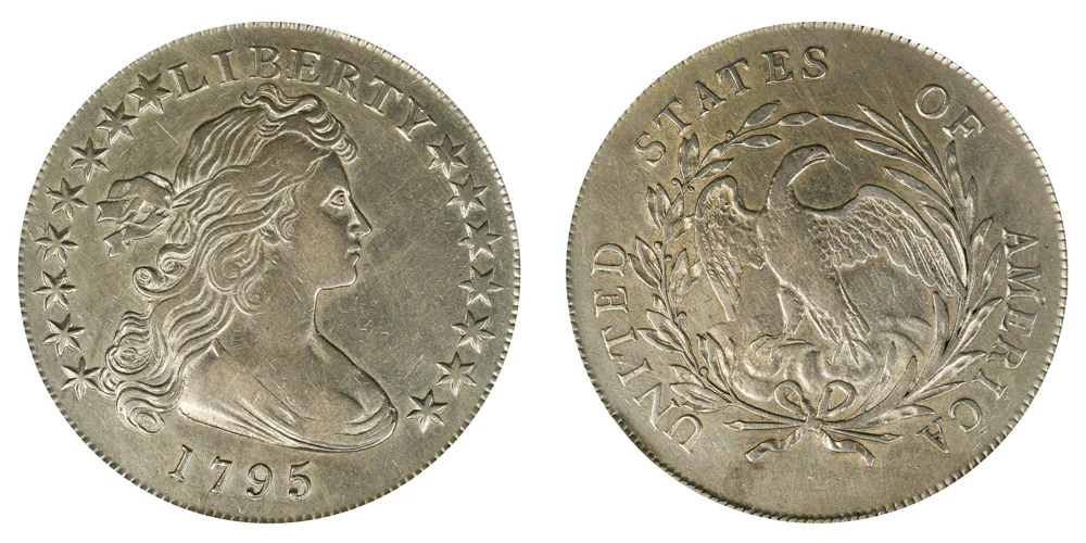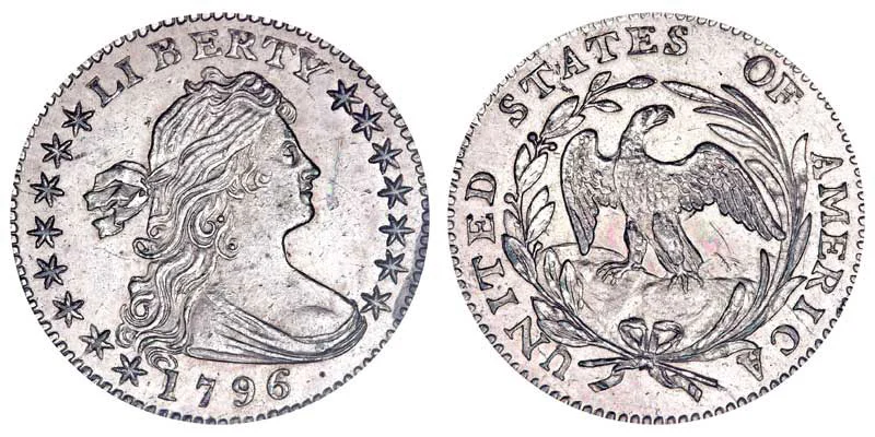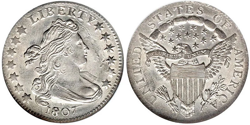 Many of the United State's early coins were designed and engraved by Robert Scot. The Draped Bust obverse design was applied to a wide range of denominations of US coins and included the Draped Bust Half Cent, Draped Bust Large Cent, Draped Bust Half Dime, Draped Bust Dime, Draped Bust Quarter, Draped Bust Half Dollar and Draped Bust Silver Dollar. Scot designed both varieties that included the small eagle and heraldic eagle that appeared on the reverse of these coins. Here are some of his designs shown below: