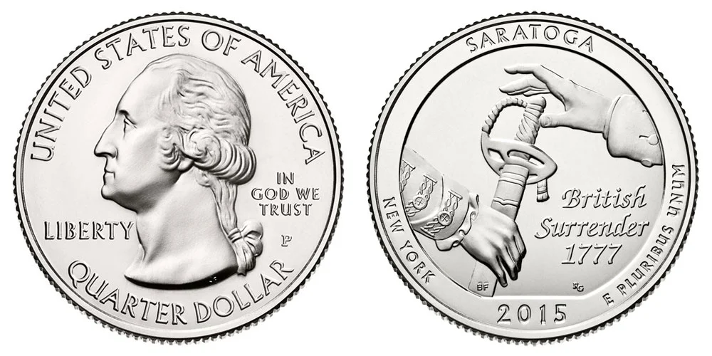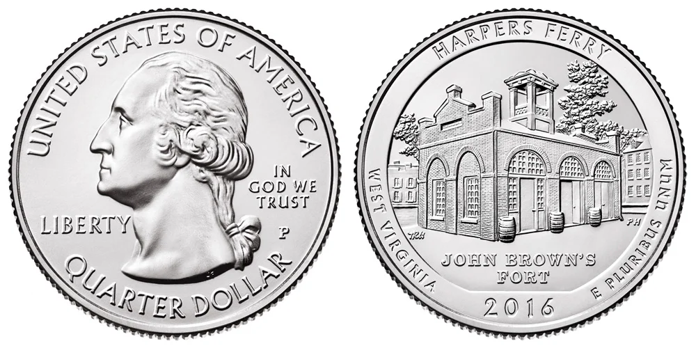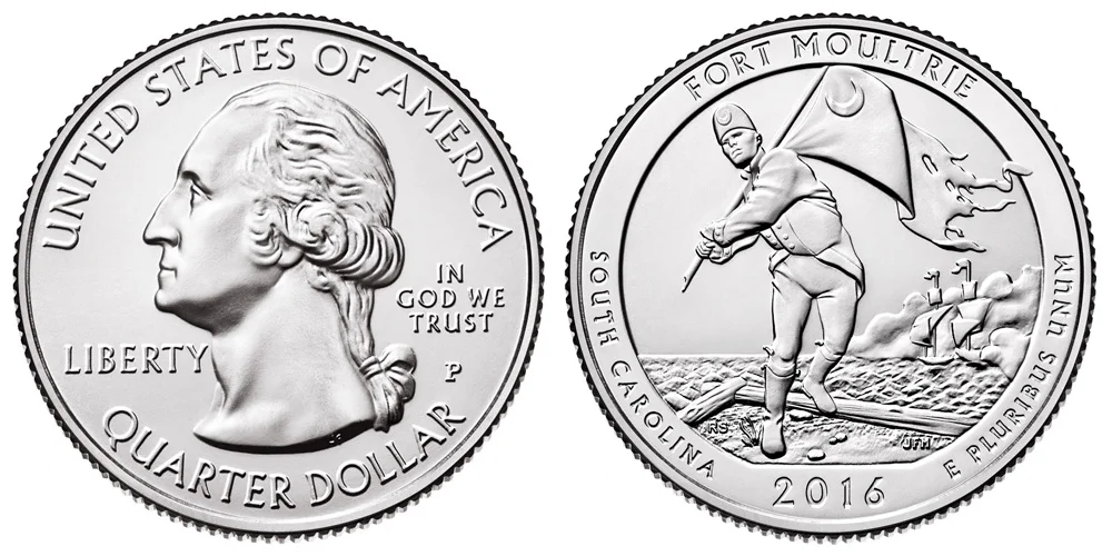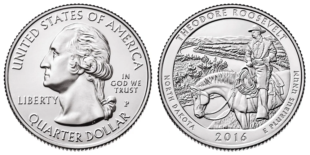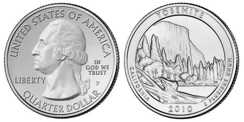 The first coins would be released in 2010. The obverse (front side or heads side) of the coin would depict the modified version of John Flanagan's original 1932 design of the Washington Quarter, depicting a bust of Washington. This modified version is the same one used during the 50 State Quarter program, a smaller bust of the first US President, designed by William Cousins. This would be the common obverse that would be used every year and for every design of the national park quarters. The text "UNITED STATE OF AMERICA" would be placed along the upper rim while "QUARTER DOLLAR" would be placed along the bottom rim. The word "LIBERTY" would be just to the left of Washington and "IN GOD WE TRUST" to the right, with the mint mark just below.