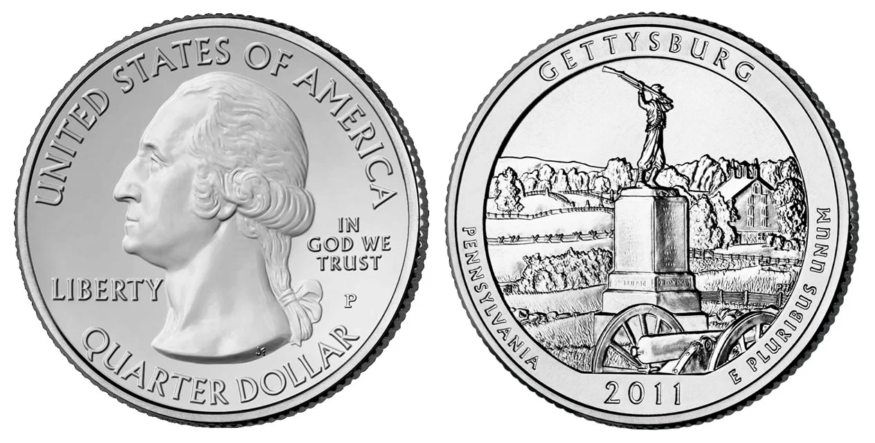 Gettysburg National Military Park Depicted on the coin is the 72nd Pennsylvania Infantry Monument, which stands on the battle line of the Union Army, located in Cemetery Ridge. |