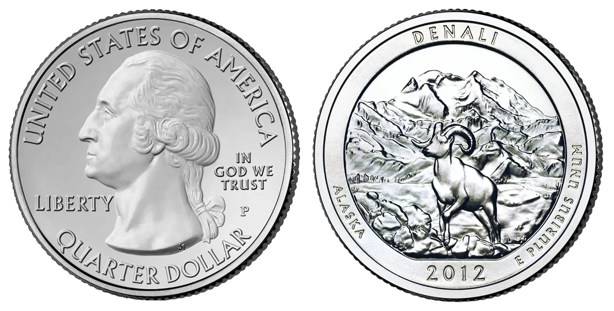 Denali National Park Depicted on this quarter is the 20,237 ft Mount McKinley, the tallest mountain in the United States and North America. Aldo depicted is a native Dall Sheep in the foreground. |