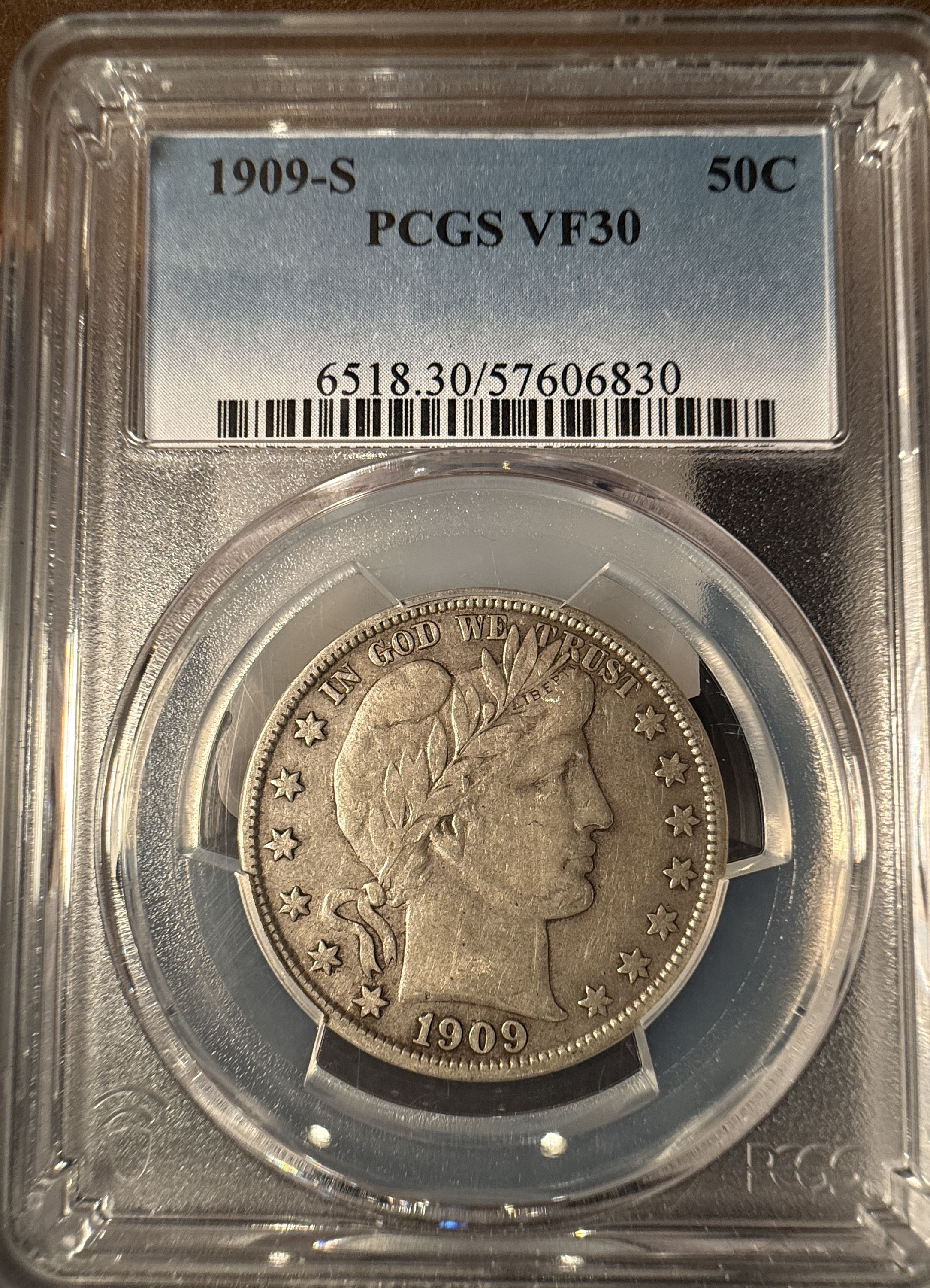 1909-S Barber Half Dollar, VF30 PCGS (14098)1909-S Barber Half Dollar, VF30 PCGS (14098)1909-S Barber Half Dollar, VF30 PCGS (14098)1909-S Barber Half Dollar, VF30 PCGS (14098)