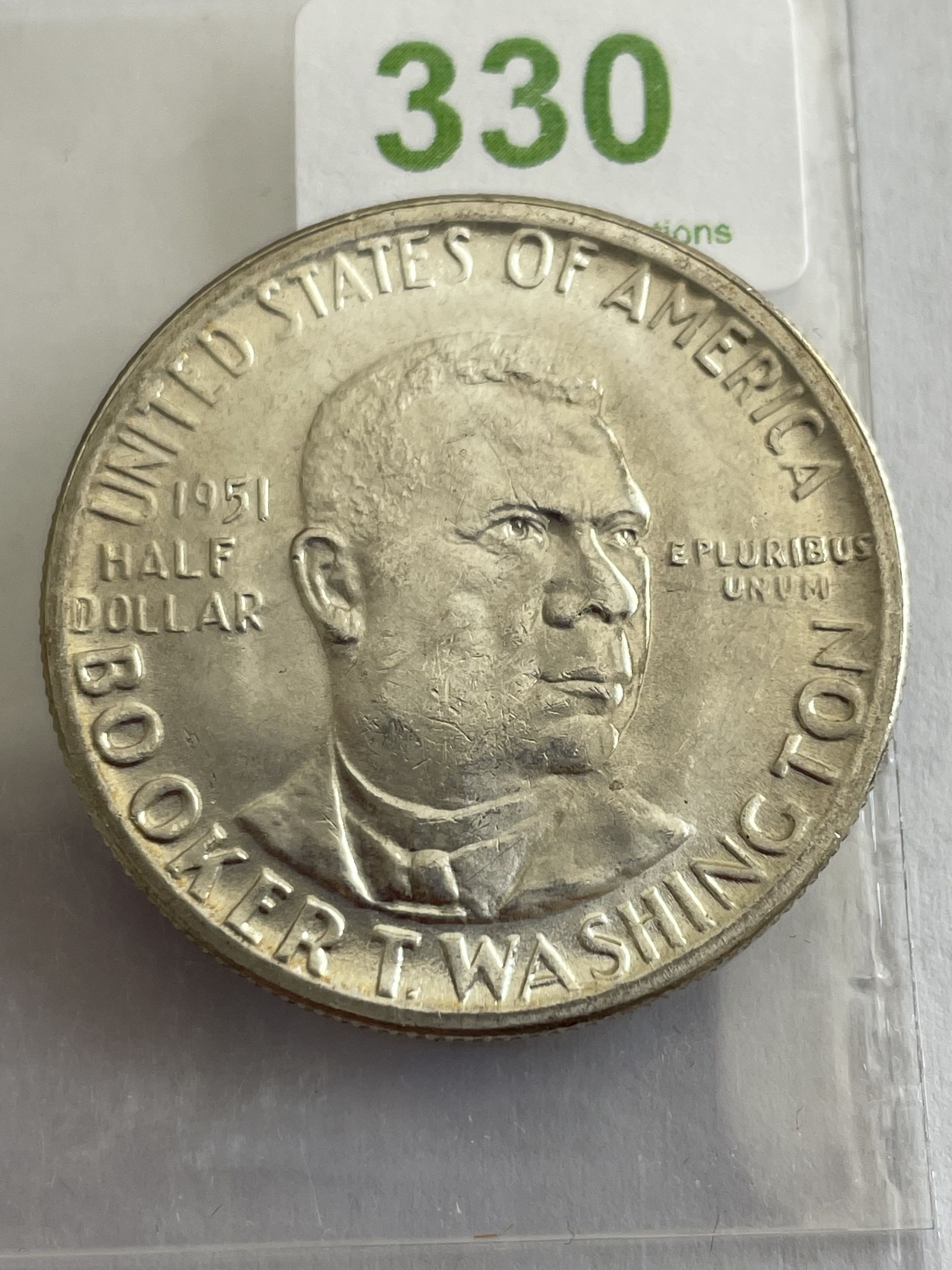 I have a 1951 BOOKER T. WASHINGTON Commemorative Half Dollar for sale. It is 90% silver and the mintage was only 210K. In my opinion, the coin appears to be in GEM BU condition. However, I am not a coin grading expert. Please review the pics closely before purchasing.