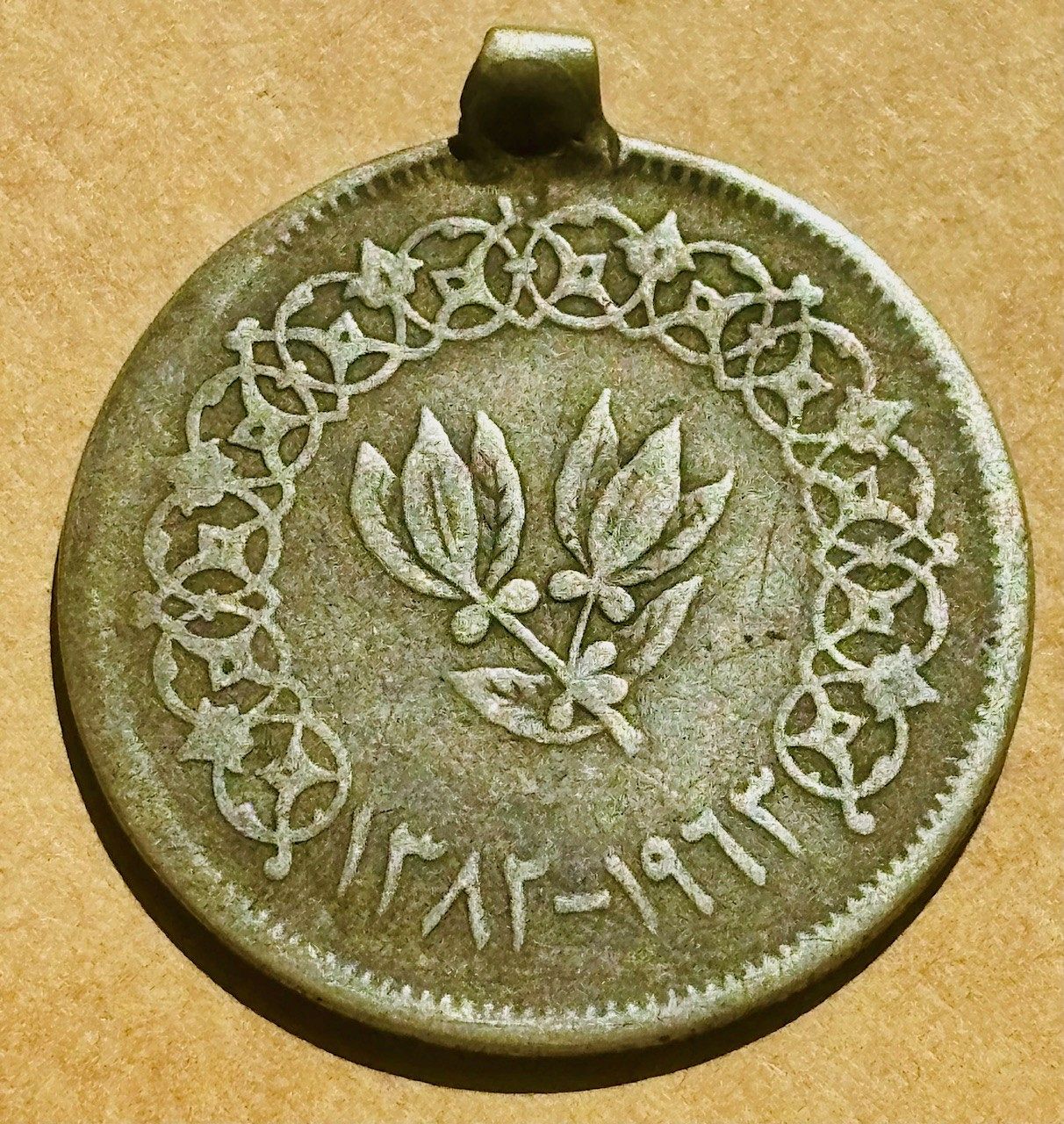 1963 Yemen Arab Republic (the former North Yemen) 20 buqsha. Was part of jewelry. 20 buqsha is 20 percent of a Yemeni riyal.