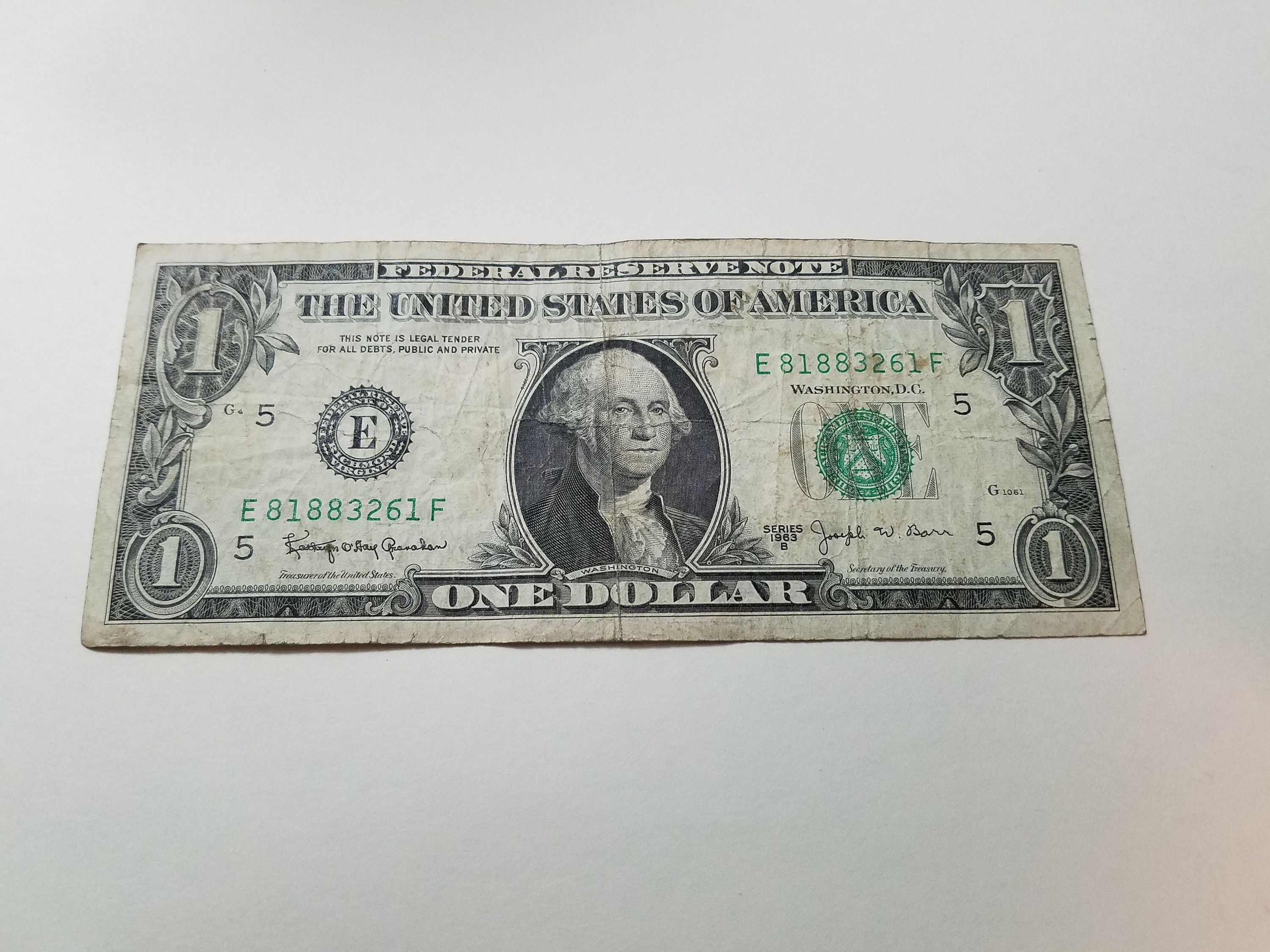 1963 Series B $1 Federal Reserve Joseph W Barr Note One Dollar E81883261F1963 Series B $1 Federal Reserve Joseph W Barr Note One Dollar E81883261F