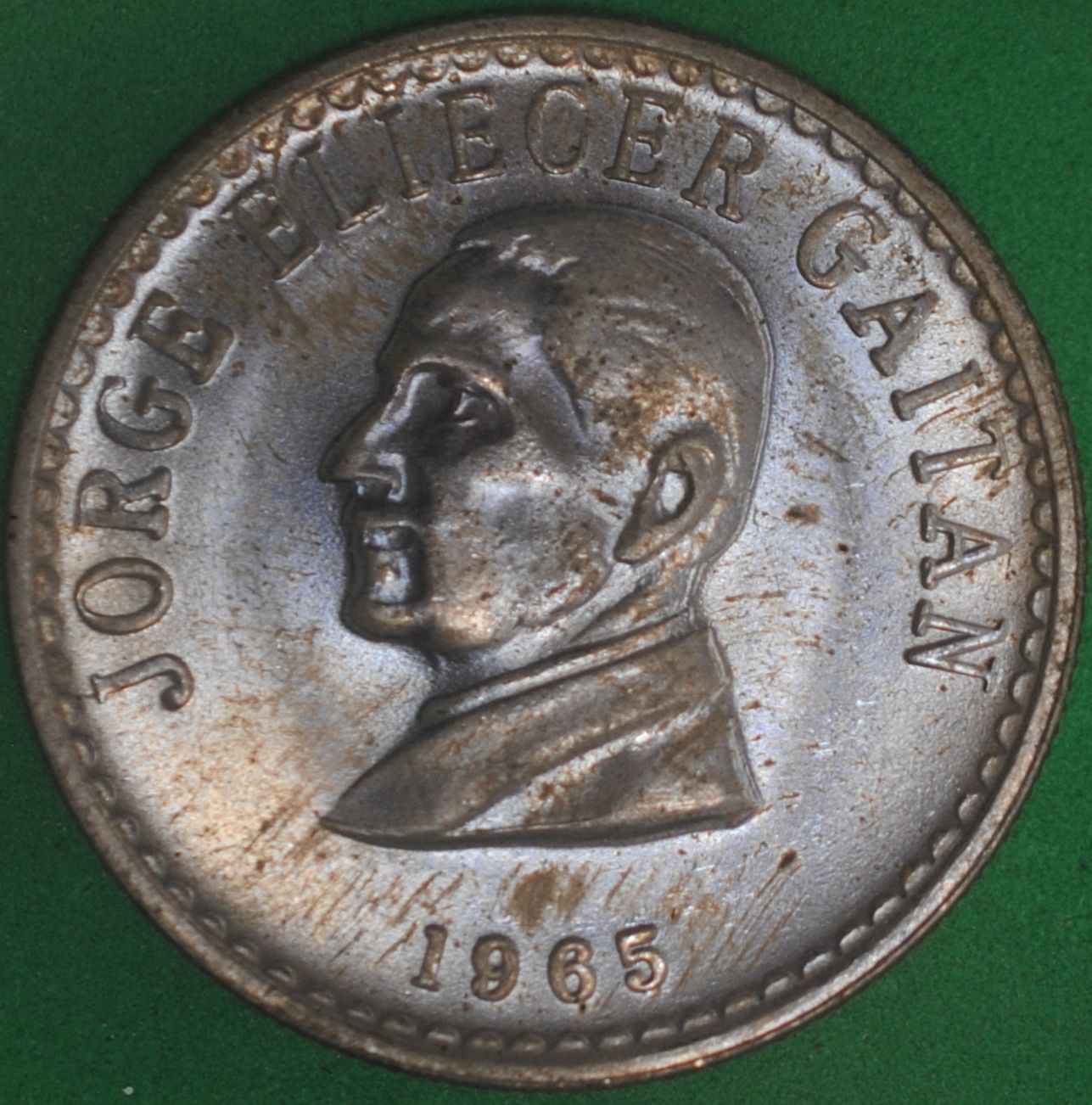 1965 Colombia 50 Centavos UNC. Streaks of envelope patina.