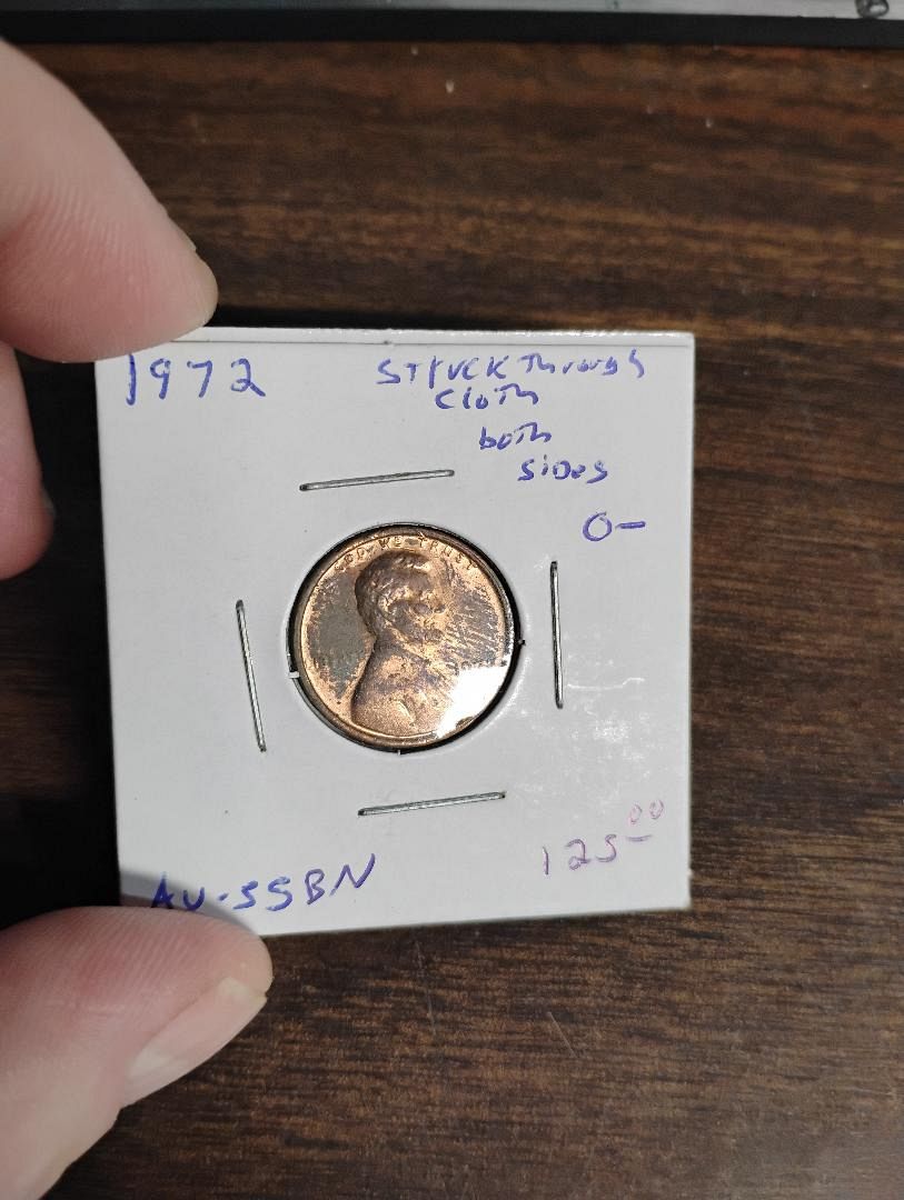 1972 lincoln memorial cent au-55 bn, struck through cloth obverse & reverse